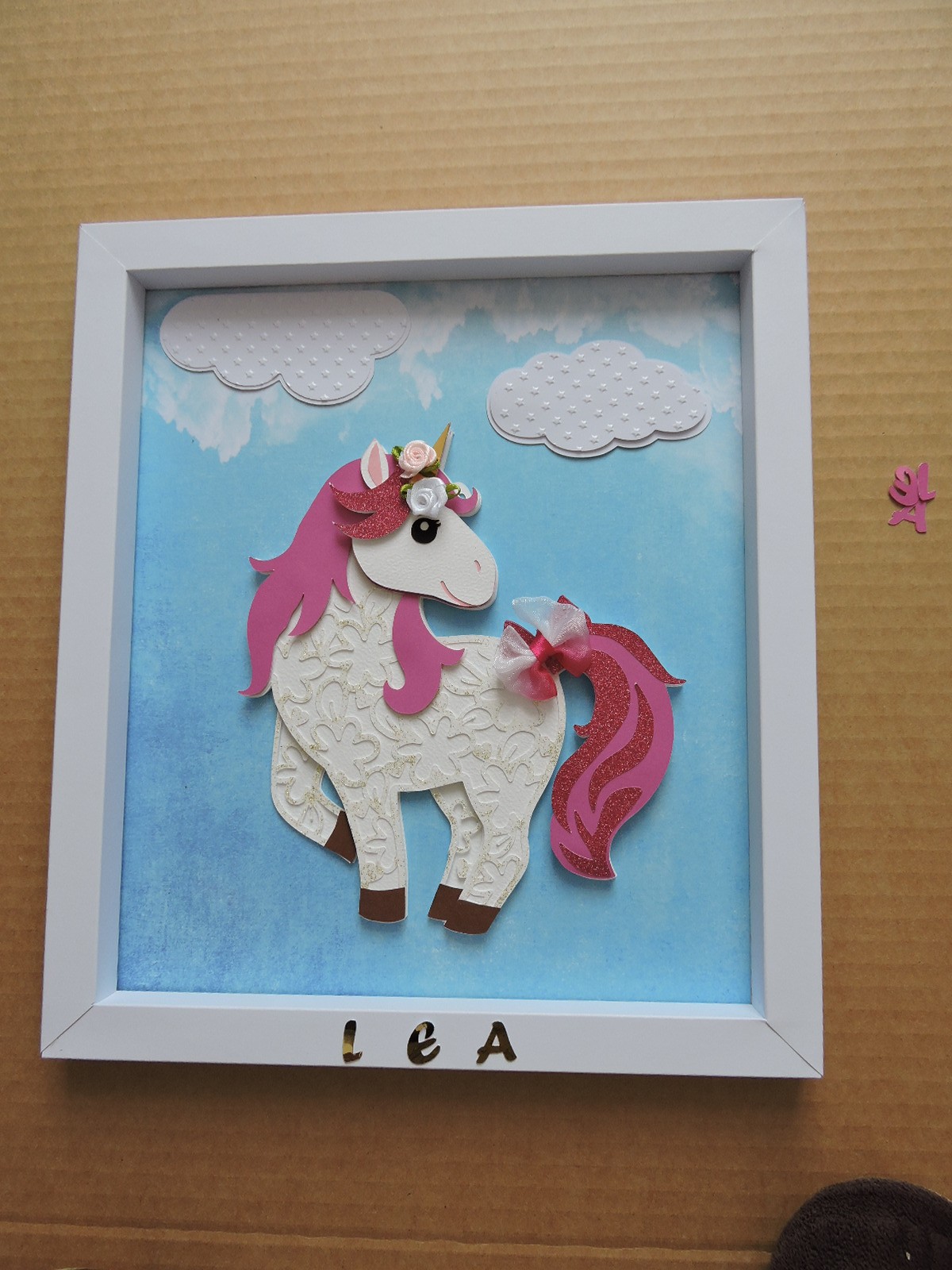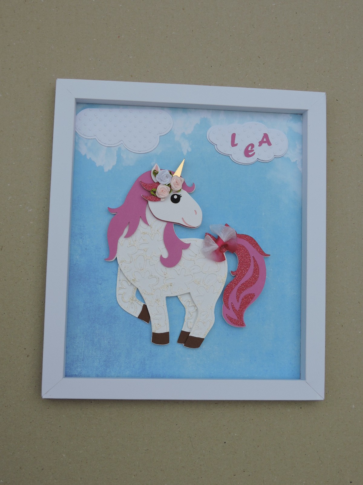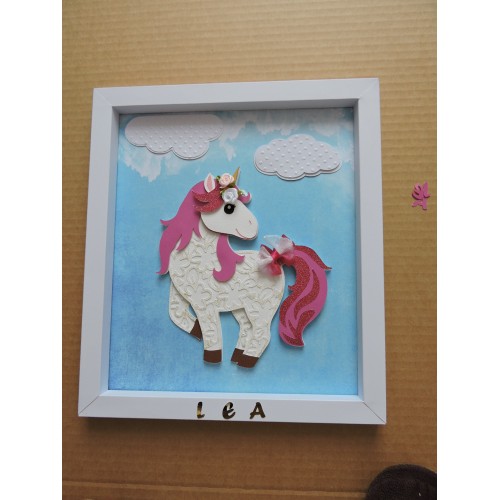 Ce cadre très décoratif est entièrement fait en carton de plusieurs épaisseurs, la licorne est découpée dans du carton blanc et de couleur pour être ensuite collée en 3D sur un fond dégradé bleu. Le prénom de l'enfant est inscrit sur les nuages. Le prénom peut être indiqué sur le cadre.