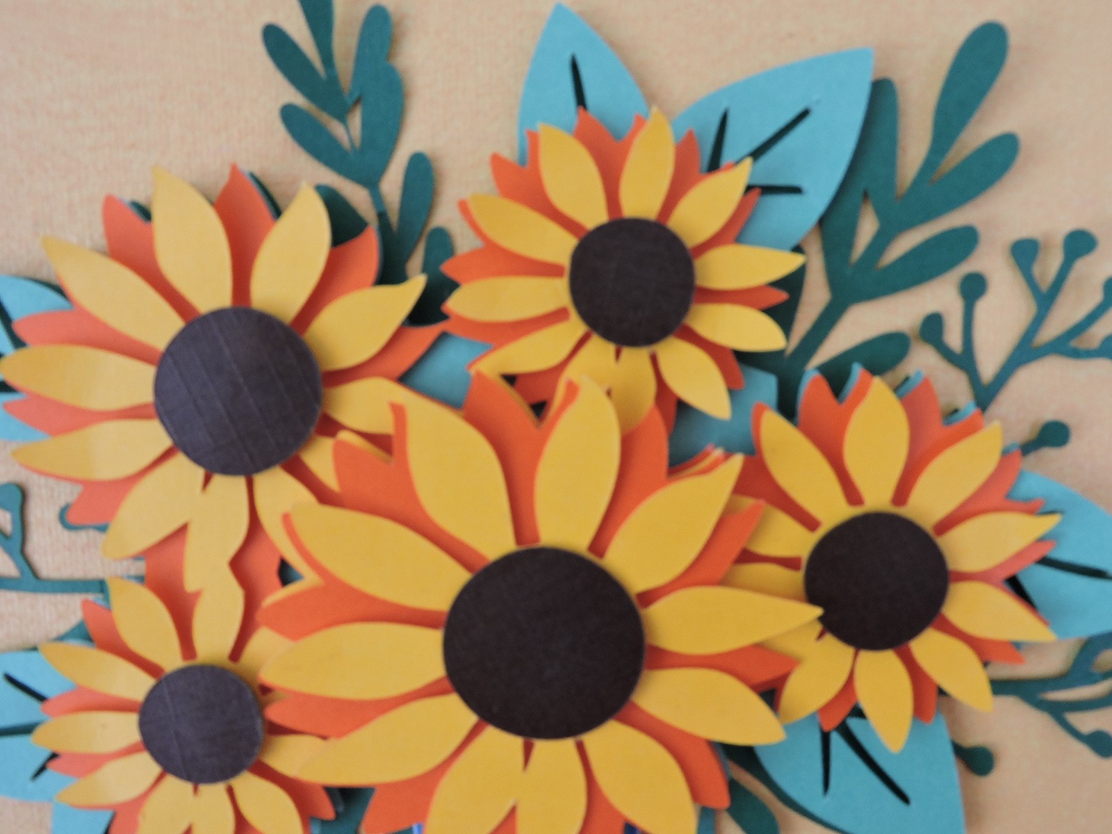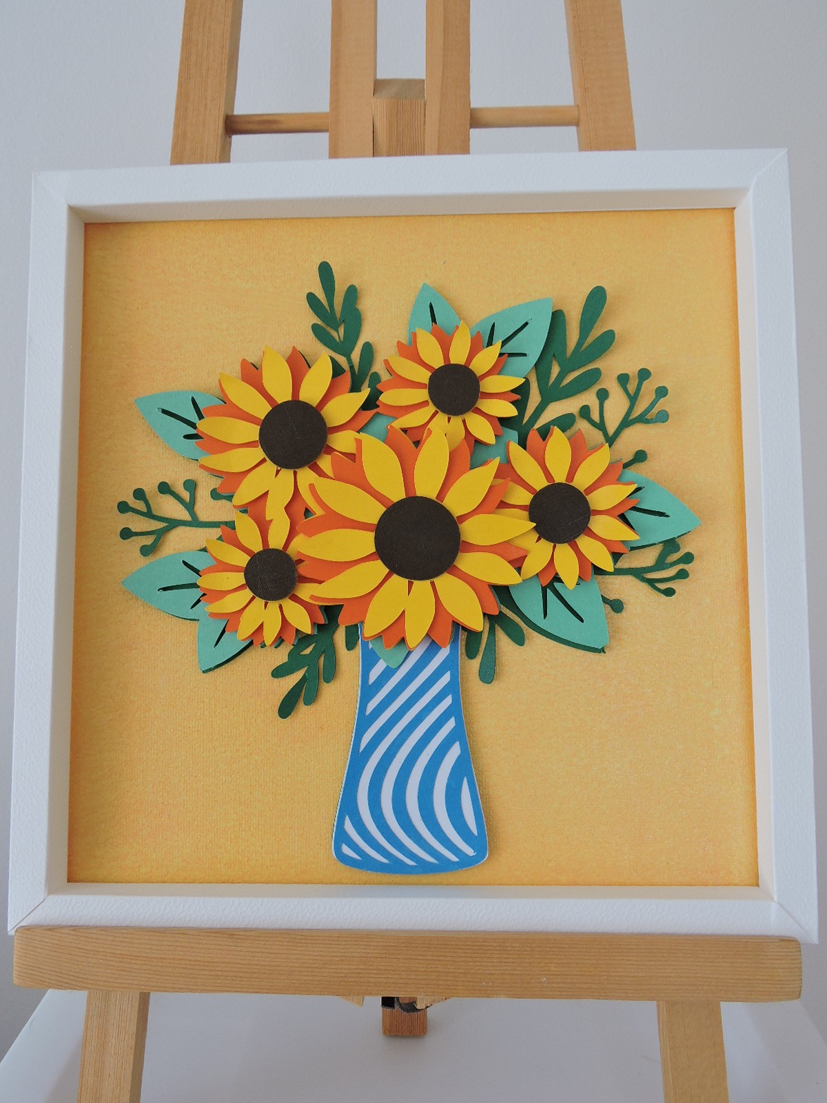 Cette composition florale est faite de papiers superposés de différentes couleurs,qui s’assemblent pour donner un effet 3D..Le vase de tournesols est collé sur un carton entoilé peint à l’acrylique.