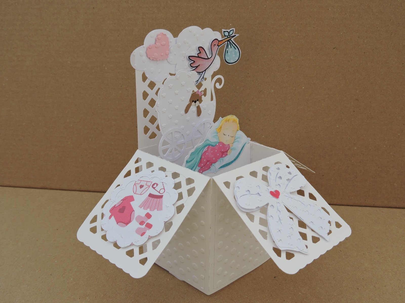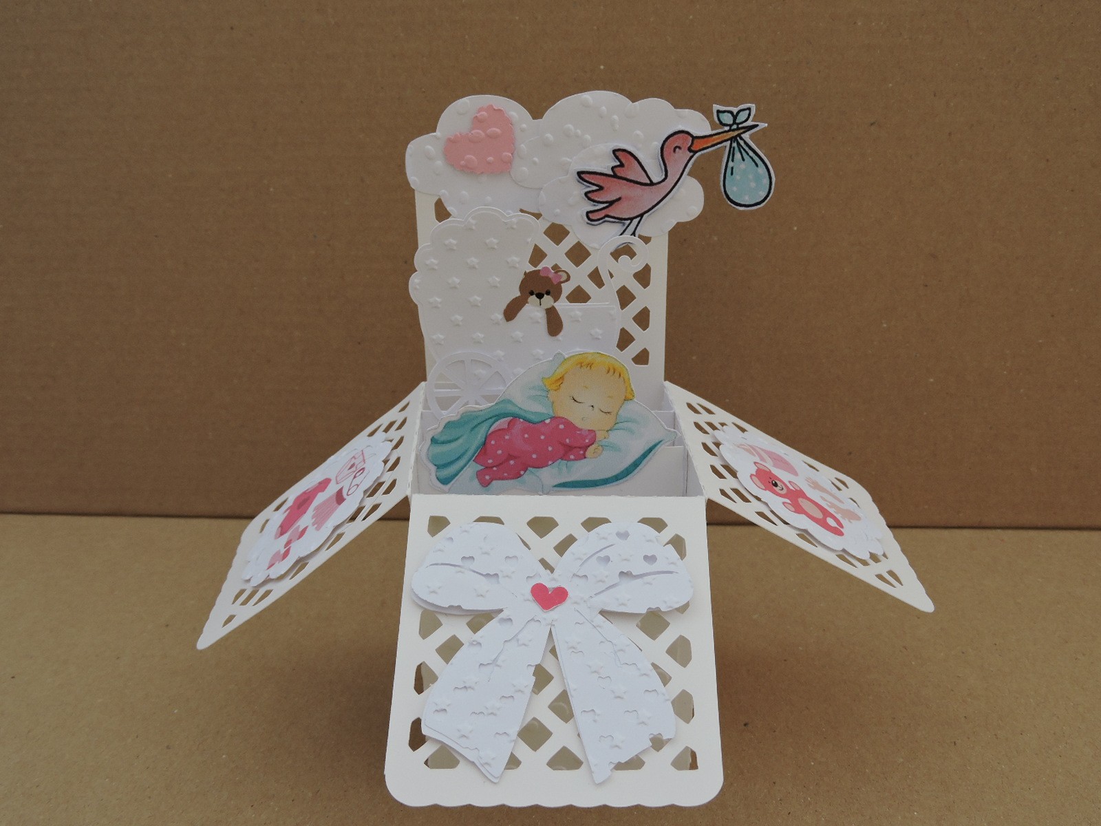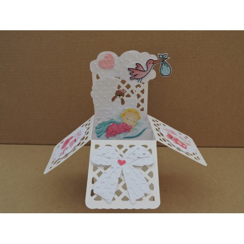 Pour annoncer ou accompagner un cadeau de naissance cette carte pop up qui semble ordinaire fermée, devient magique lorsqu’elle est ouverte. En l’ouvrant elle devient une boite où l’on peut contempler des petits décors. Elle peut être personnalisée en ajoutant un prénom. Les dimensions de la carte fermée sont d’environ 15 x 13 cm. Son enveloppe est de 16.5 x 16.5 cmLe dos de le carte est porteuse d'une petite enveloppe et de son message. elle tient par un trombonne de couleur blanche