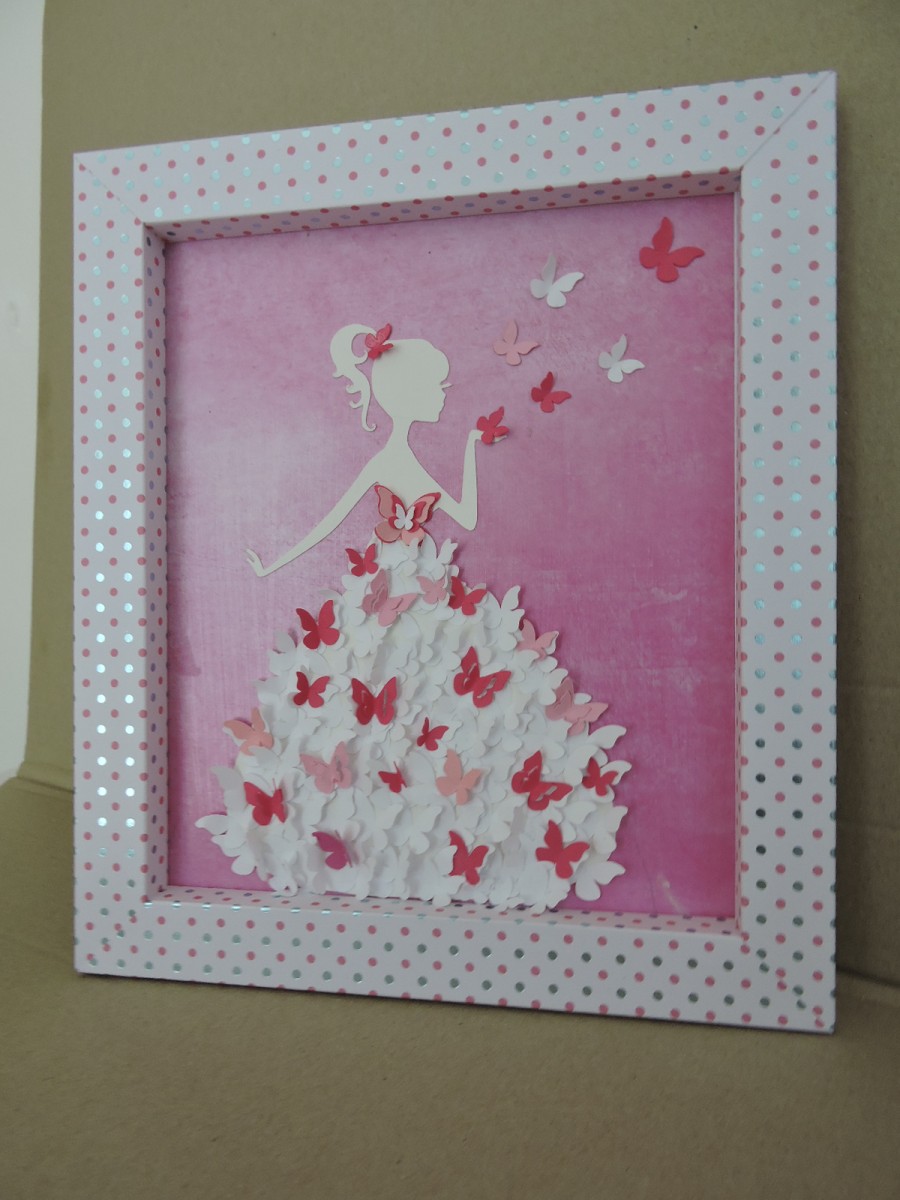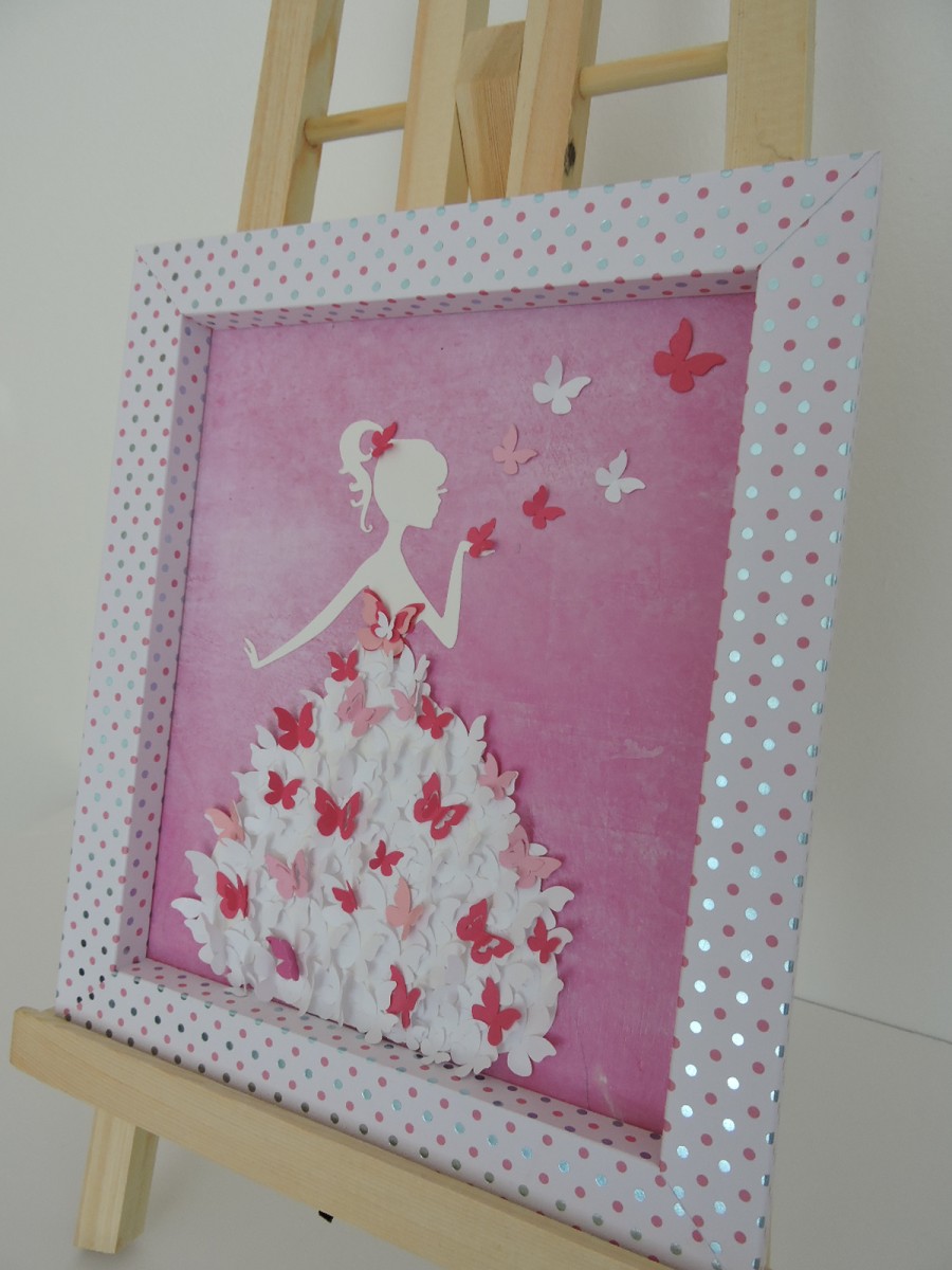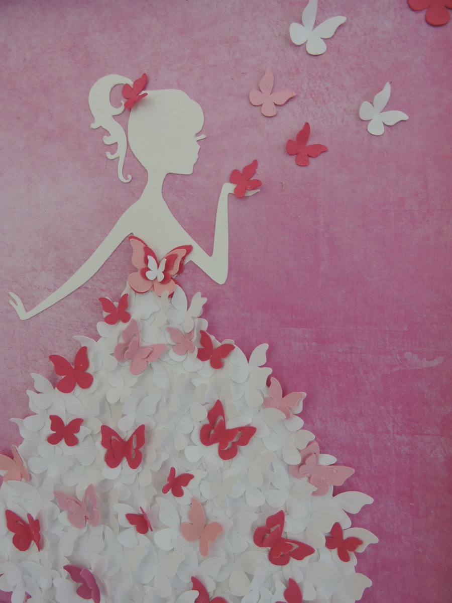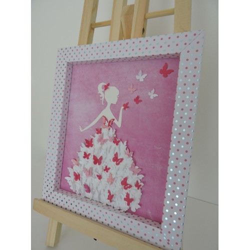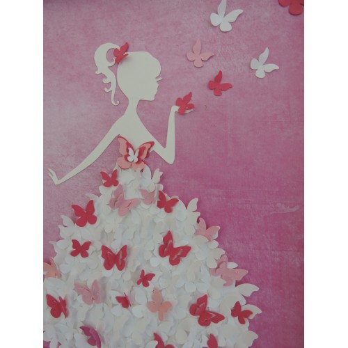 Ce cadre très décoratif est entièrement fait en carton de plusieurs épaisseurs, la silhouette de femme est découpée dans du carton blanc pour être ensuite collée sur un fond dégradé rose. Une multitude de papillons blancs et roses constitue la robe.