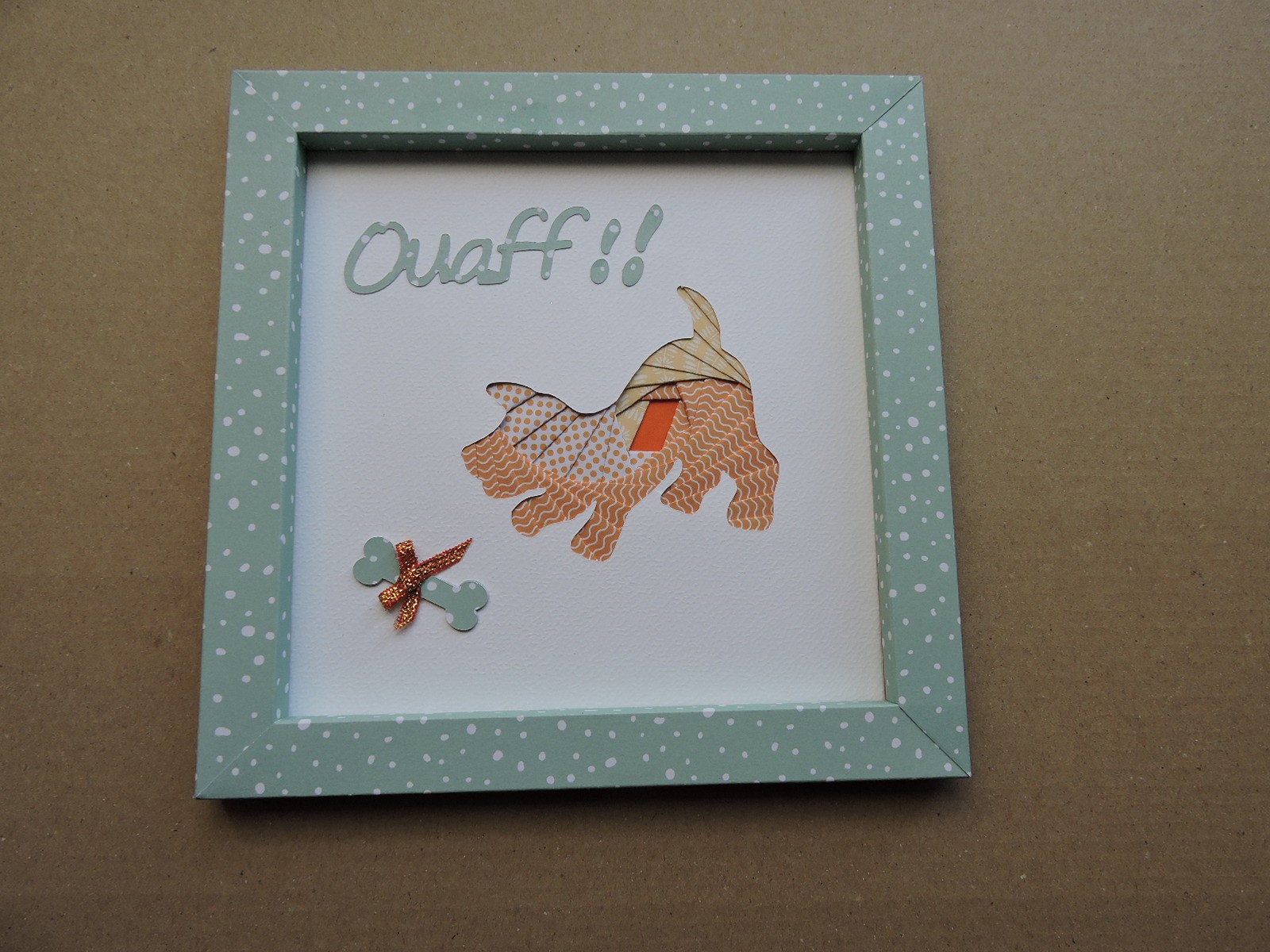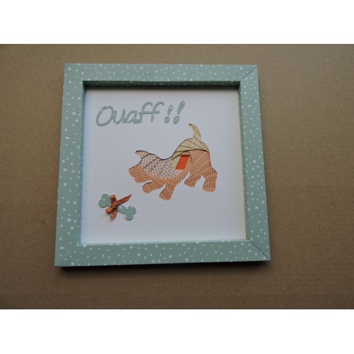Cadre réalisé en papier cartonné imprimé de couleur verte, le petit chien est réalisé en iris folding.